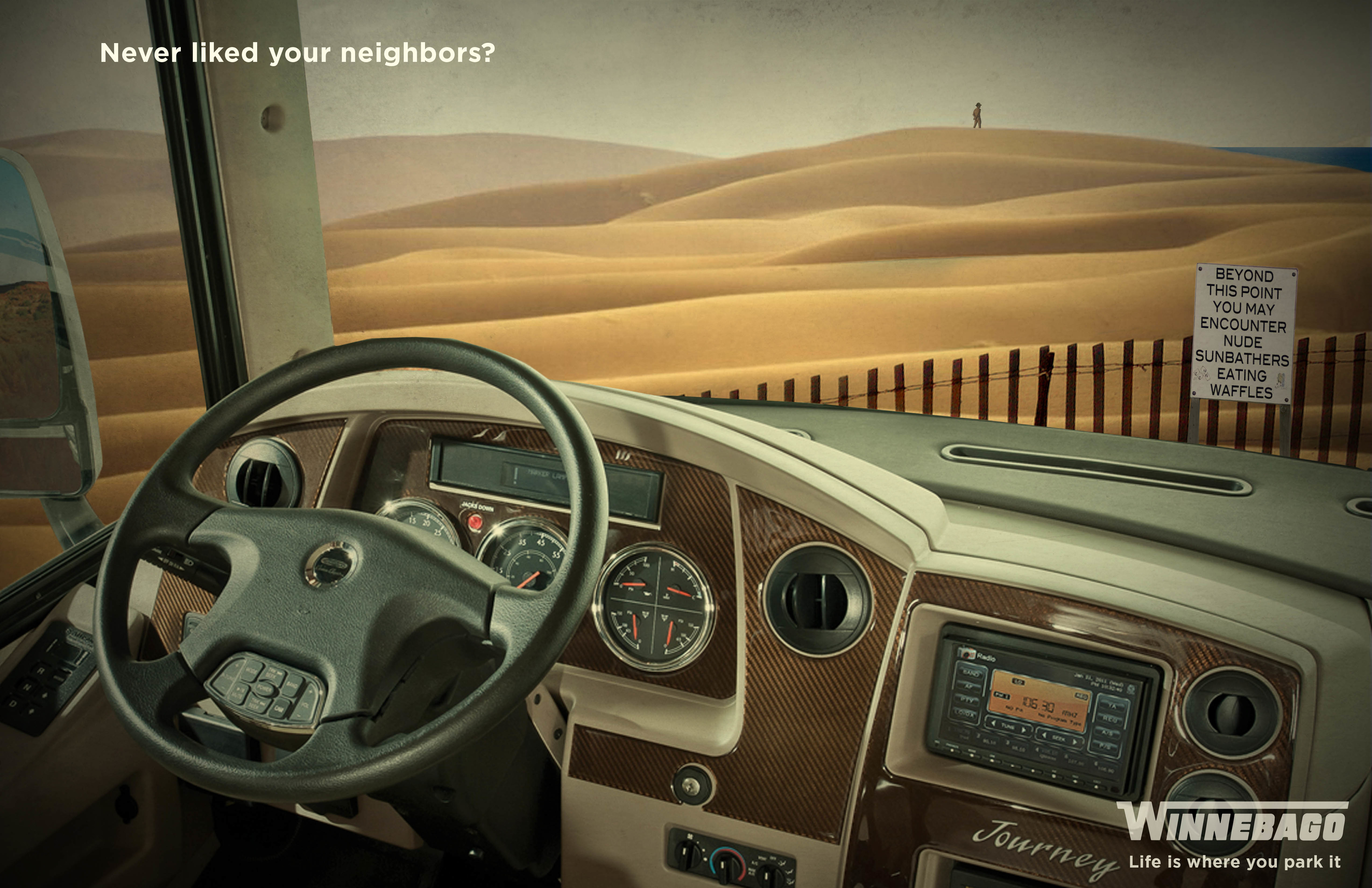 Winnebago needs to expand outside the usual Baby Boomers. To do so, we're reminding people that normal vehicles only give you what is on the inside of the car. But when you buy a Winnebago, you get a Winnebago and all the places you can drive it.